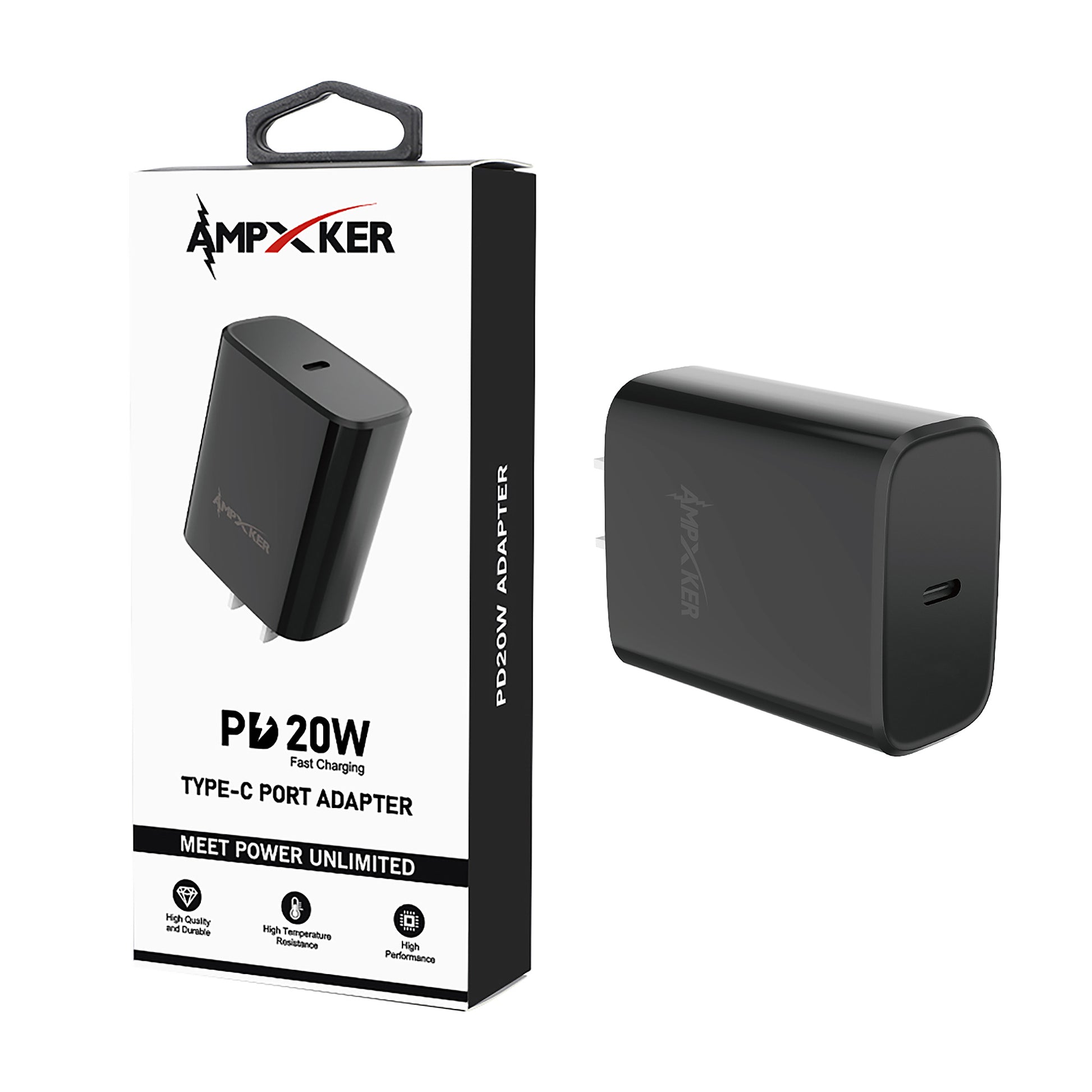 AMPXKER Type-C (PD) fast-charging wall adapter, UL-certified, 20W power delivery for rapid and safe charging. Black color.