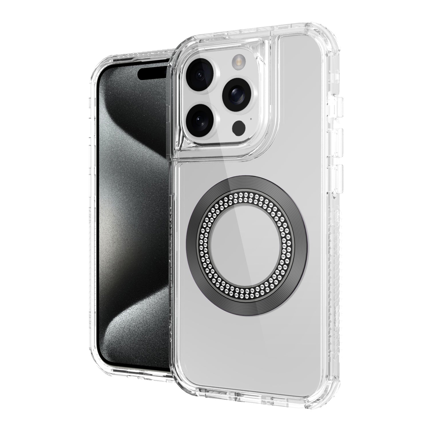 A crystal-clear hybrid case featuring a jeweled magnetic ring, chrome detailing, and durable shockproof protection. Designed for iPhone 14 Pro Max while showcasing the phone’s original color.