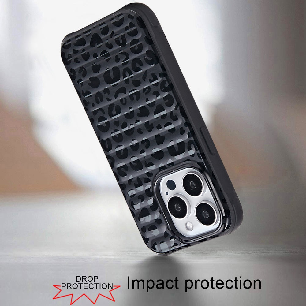 Stylish black leopard patterned case with chrome accents and built-in magnetic ring for fast charging compatibility. Provides durable protection, a premium feel, and a bold fashion look for iPhone 14 Pro Max.
