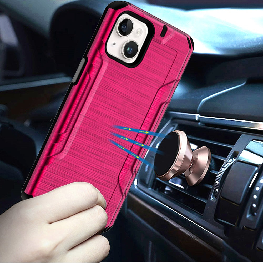 Premium brushed hybrid case for iPhone 15 Plus featuring dual-layer shockproof protection, textured anti-slip grip, and durable slide-out design in hot pink.