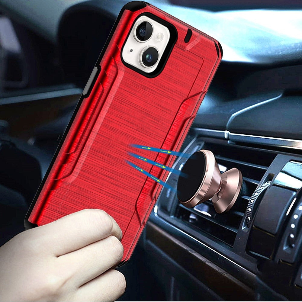 Durable brushed hybrid case for iPhone 15 Plus featuring dual-layer shockproof protection, anti-slip texture, and rugged slide-out design in red.