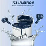 Stylish navy-white true wireless earbuds featuring clear stereo sound and a compact charging case for everyday listening.