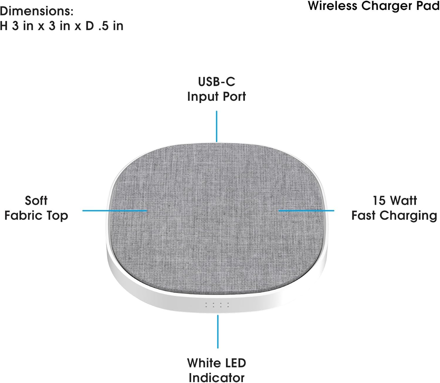 15W fast wireless charger with linen-style gray fabric surface and white frame. Compatible with iPhone 16–11 series, Samsung S24, AirPods, and all Qi devices.